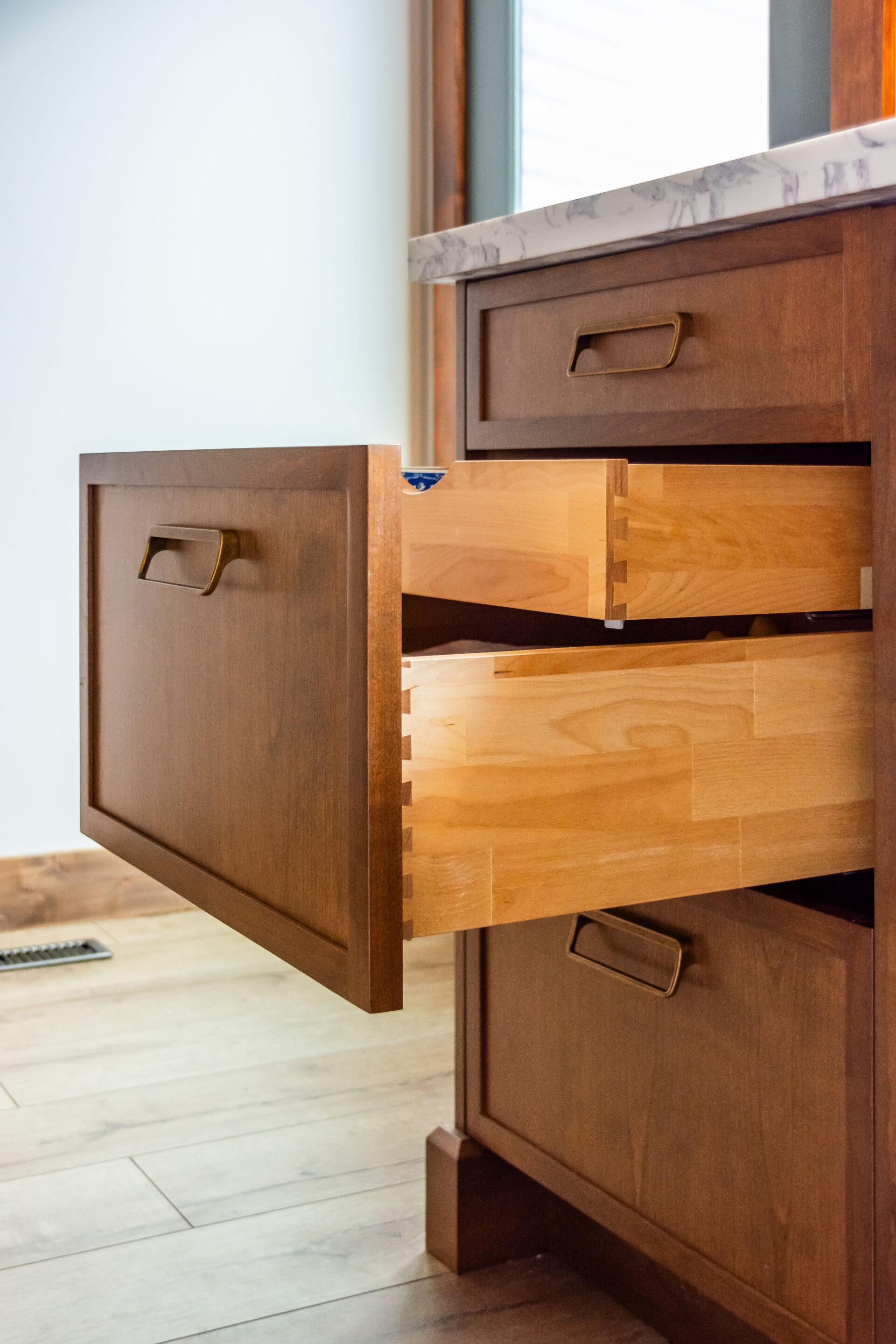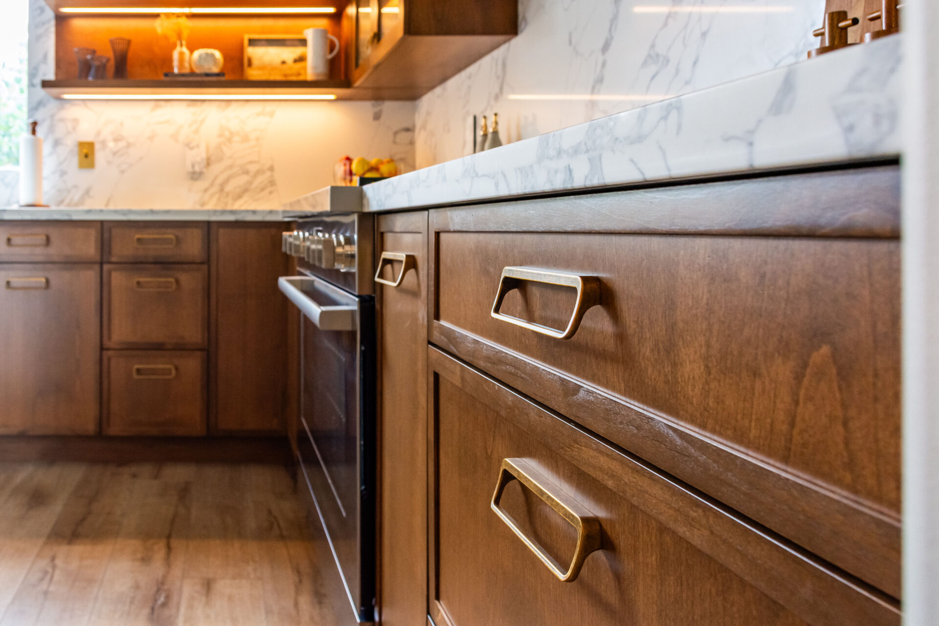 To create consistency and elevate the look, longer pulls were used throughout, except on the four upper cabinet doors. This small change enhanced visual flow and made the uppers stand out as a subtle design feature. The decorative style and brass finish of the hardware also adds to the apothecary feel of the space.