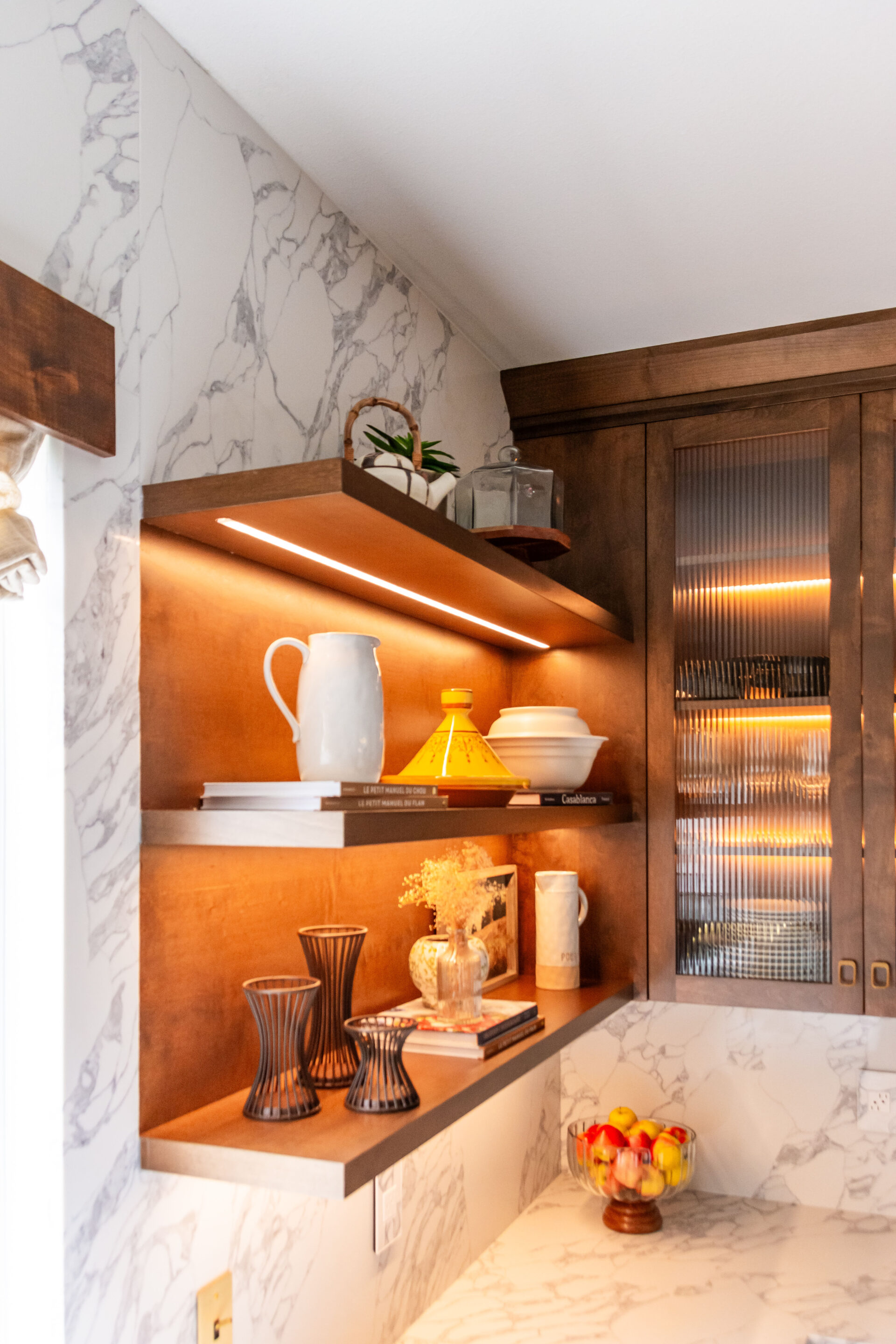 The open shelves around the sink became a client favourite. They provide visual openness and display space while maintaining cohesion through matching stain and integrated lighting.